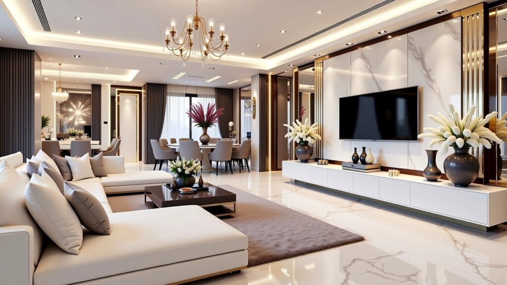 Neutral colors like white, beige, and grey create a modern look, while decorative lights enhance the beauty of the room.
